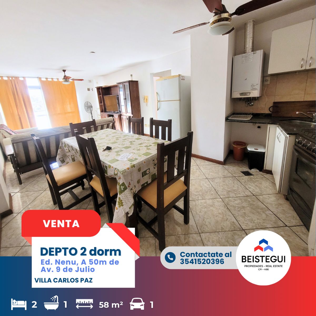 Departamento en Venta - Una excelente oportunidad de inversión te espera en el corazón de la ciudad. Presentamos este luminoso departamento con balcón a la calle, ubicado en el primer piso del edificio Nenu, a solo 50 metros de la Av. 9 de Julio. Características Principales: Área total: 58 metros cuadrados. 2 dormitorios, uno de ellos con placard empotrado para un óptimo aprovechamiento del espacio. 1 baño. Amplio e iluminado. Cochera propia y espaciosa para tu comodidad y seguridad. Bauleras para guardado de objetos. Comodidades del Edificio: Terraza con vistas a la montaña. Quincho con asador de uso común. Piscina para disfrutar de momentos de relax y diversión. Beneficios de Inversión: Ubicación estratégica a pocos pasos del centro de la ciudad, con fácil acceso a servicios, transporte público y comercios. Potencial de alta rentabilidad debido a la demanda de alquiler en la zona. Estilo de vida confortable, ideal para atraer a inquilinos de calidad. Ambiente seguro y tranquilo, perfecto para garantizar una inversión sólida y rentable. Precio y Condiciones: Precio competitivo para el mercado actual. No pierdas la oportunidad de invertir en este exclusivo departamento que ofrece tanto el potencial de alta rentabilidad como la comodidad de un hogar moderno. Contáctanos ahora para obtener más información y asegurar tu inversión en este prometedor mercado inmobiliario.